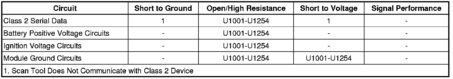 A module with an internal class 2 serial data circuit malfunction or which loses power during the current ignition cycle would have a Lost Communication DTC set by other modules. The modules that can communicate will set a DTC indicating the module that cannot communicate. When no message is detected from a learned identification number for 5 seconds, a DTC U1xxx, where xxx is equal to the 3-digit identification number, is set.