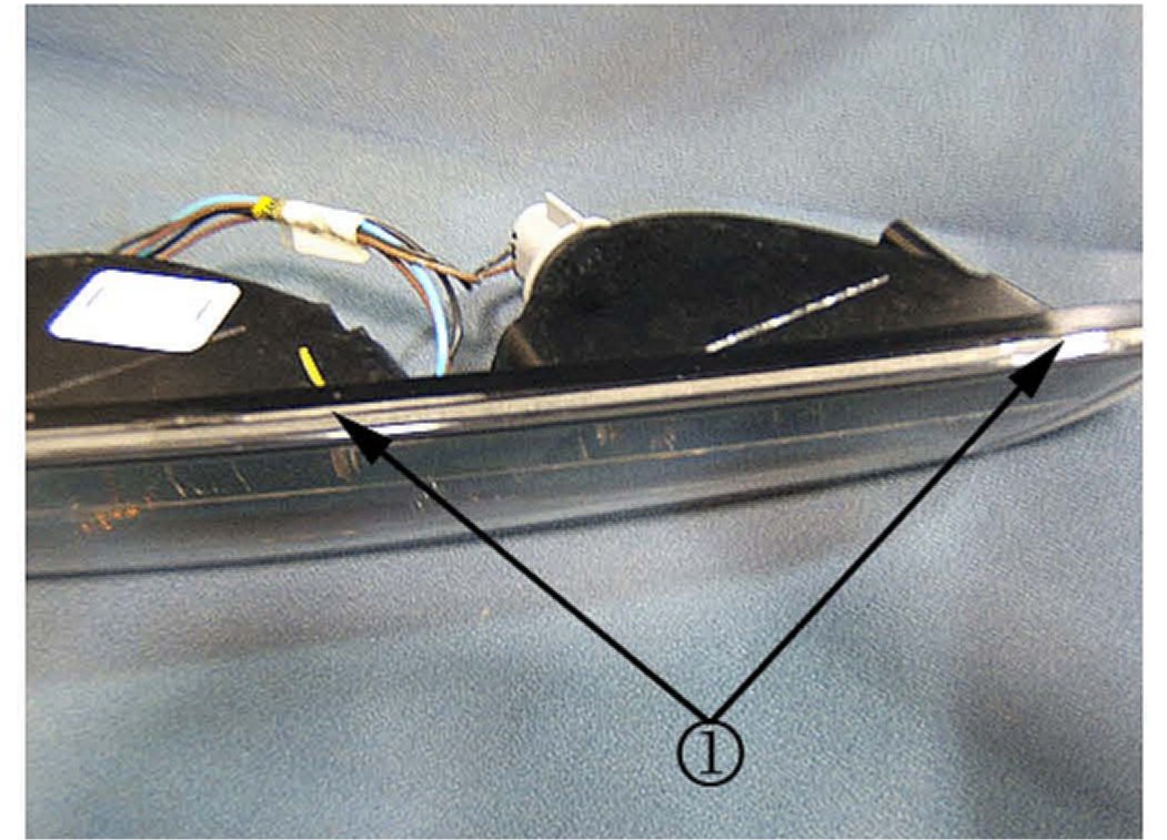 Clean the center edge (1) of the park turn signal lamp where the housing meets the lens with denatured alcohol.