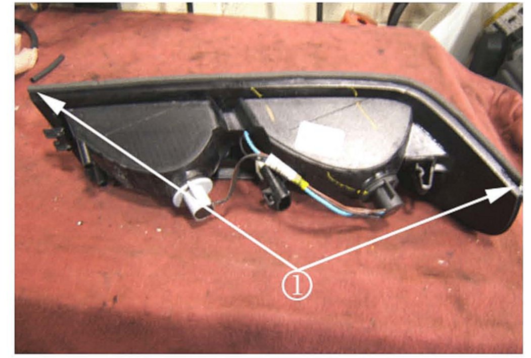 Apply the adhesive shim stock (1) to the bottom side of the park turn signal lamp around the entire center edge where the housing meets the lens.
