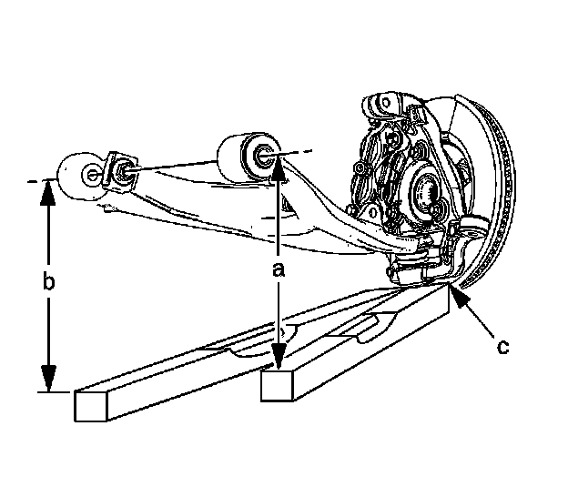 4. Set the top edge of the level on the reference surface of the steering knuckle (c) and extend the level directly under the front end of the front attachment bolt of the lower control arm (a).