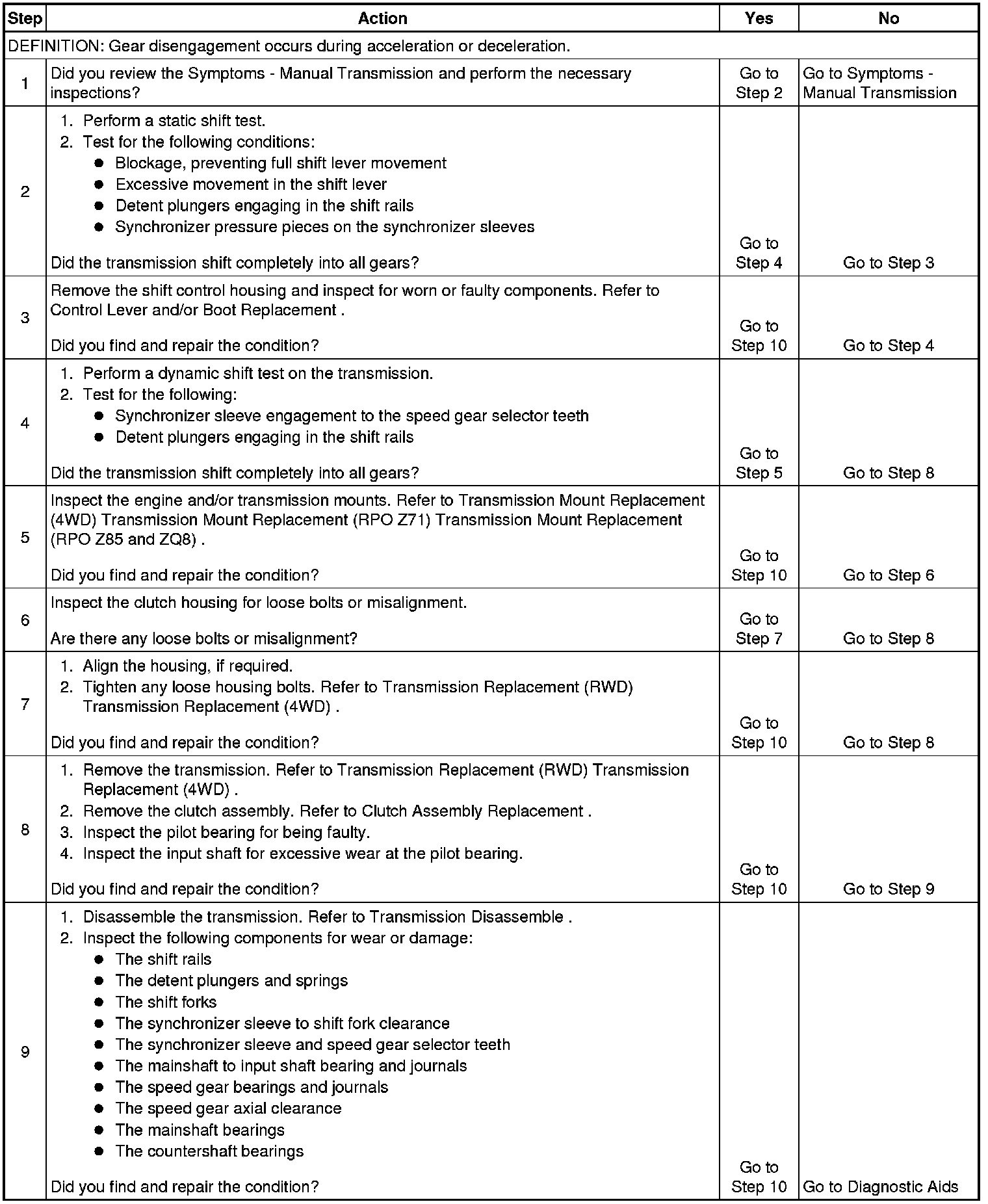 5. This step inspects for worn or damaged transmission or engine mounts. Loose mounts may cause a shock on the transmission, allowing for gear disengagement.