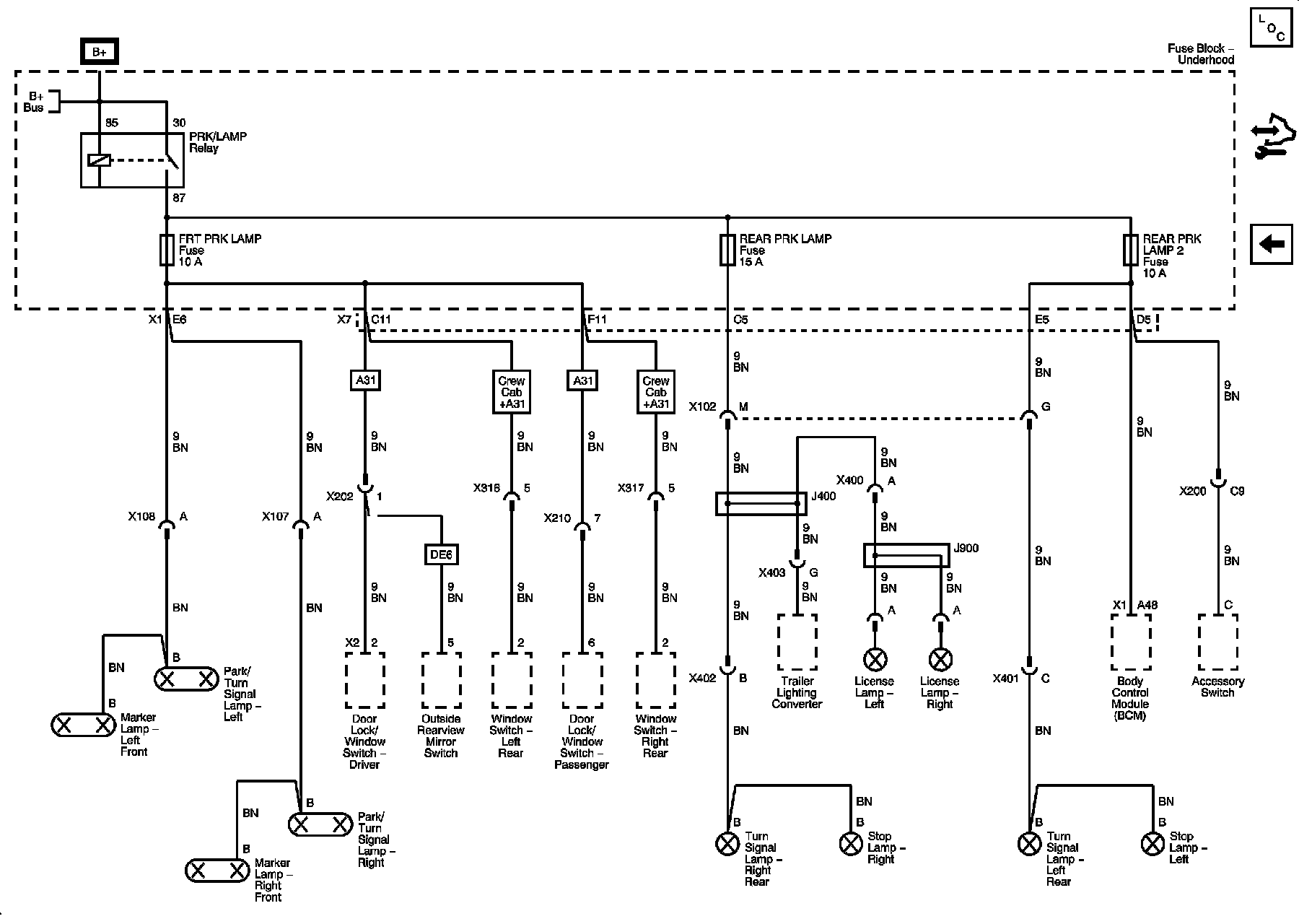 FRT PRK LAMP, REAR PRK LAMP, and REAR PRK LAMP 2 Fuses