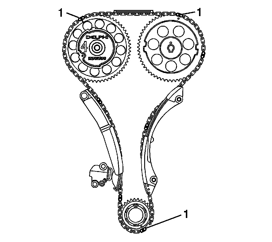 The dark links (1) on the chain should be aligned with marks on sprockets as shown.