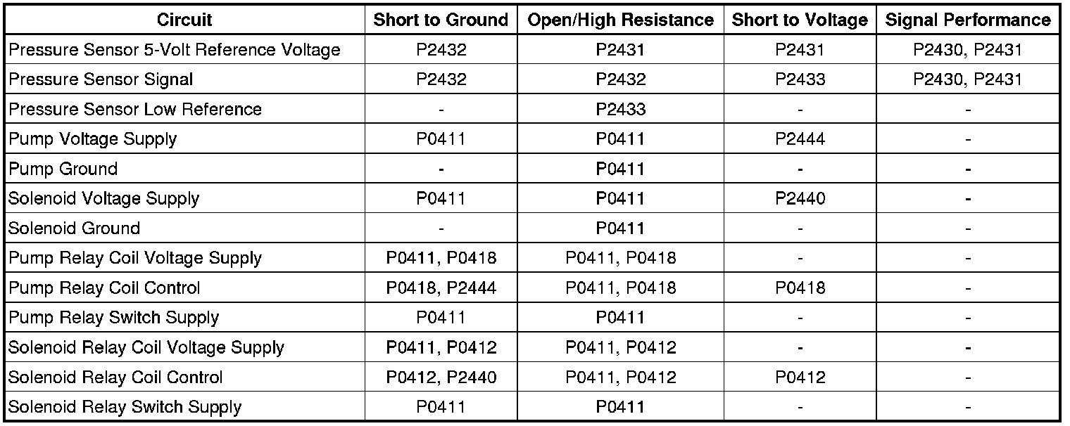 In all 3 phases, testing is accomplished by comparing the measured pressure against the expected pressure. The ECM can detect faults in the AIR pump, AIR control solenoid valve/pressure sensor assembly, and the exhaust check valve. The pressure sensor can also detect leaks and restrictions in the secondary AIR system plumbing.