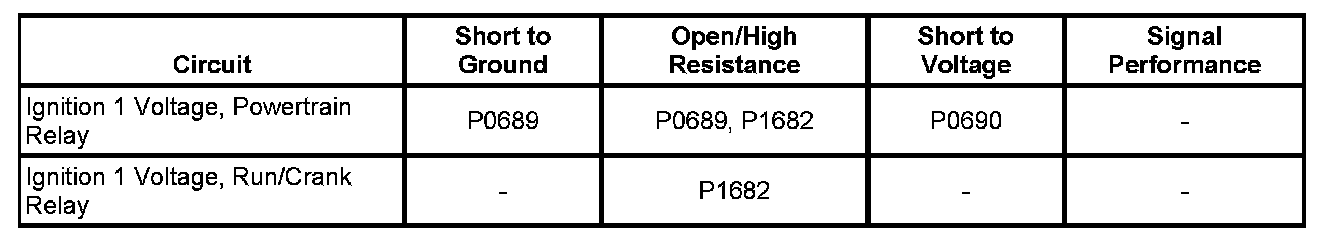 There are 2 ignition 1 voltage circuits supplied to the engine control module (ECM). The first ignition circuit is provided by the powertrain relay, through a fuse. This ignition 1 voltage circuit supplies power to all the internal ECM circuits associated with the throttle actuator control (TAC) operation. The second ignition 1 voltage circuit is supplied by the run/crank relay through a fuse, and is used to power the remaining internal ECM circuits. If the ECM detects a voltage difference between the 2 ignition 1 voltage circuits, DTC P1682 will set.