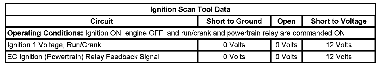 2. Ignition ON, engine OFF, observe both the Ignition 1 Voltage signal and the EC Ignition Relay Feedback signal parameters on the scan tool. Both parameter values should display no more than 3 volts difference between the 2 parameters.