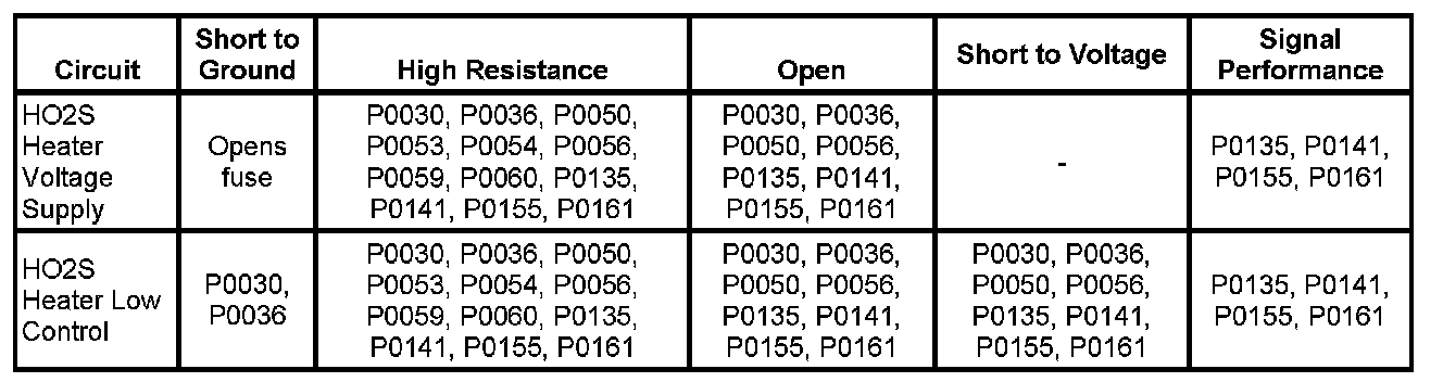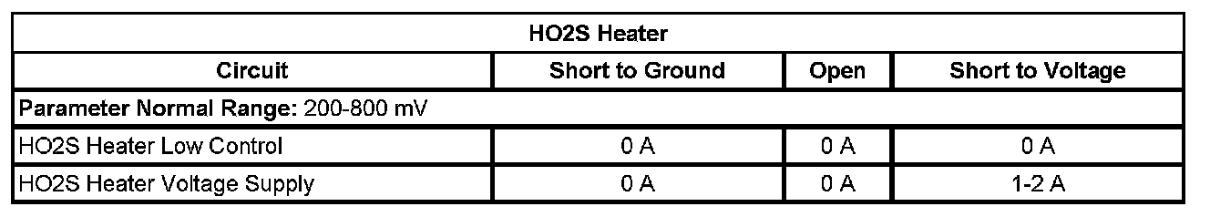 * The ECM detects that the affected HO2S heater low control circuit parameter is between 2.185-9.512 ohms at engine start-up.