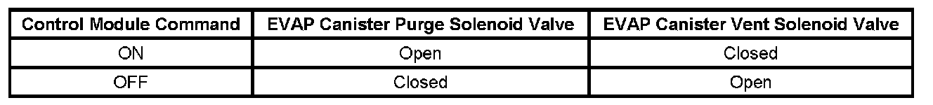 The following table illustrates the relationship between the ON and OFF states, and the Open or Closed states of the EVAP canister purge and vent solenoid valves.