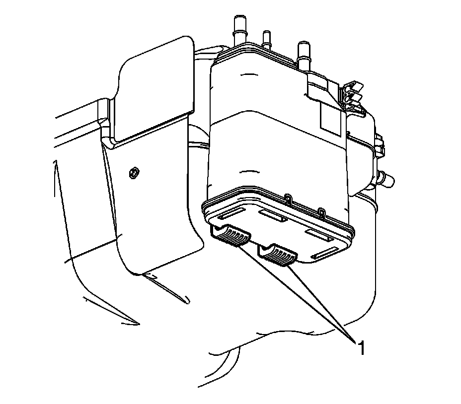 2. Using a flat bladed tool, engage the EVAP canister to the retainers (1).