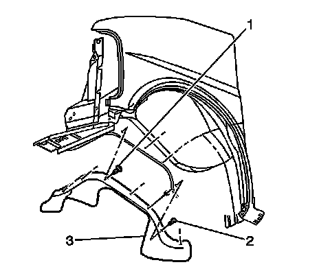 Remove the push pin retainers (1) retaining the splash shield (3) to the wheelhouse.