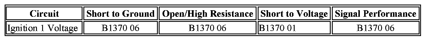 The inflatable restraint sensing and diagnostic module (SDM) monitors the ignition 1 signal from the ignition switch. When the vehicle ignition switch is placed in the RUN or CRANK position, the switch supplies voltage to the SDM ignition 1 input terminal. If an open, short to voltage, or short to ground in this SDM ignition 1 circuit is detected, then DTC B1370 will set.
