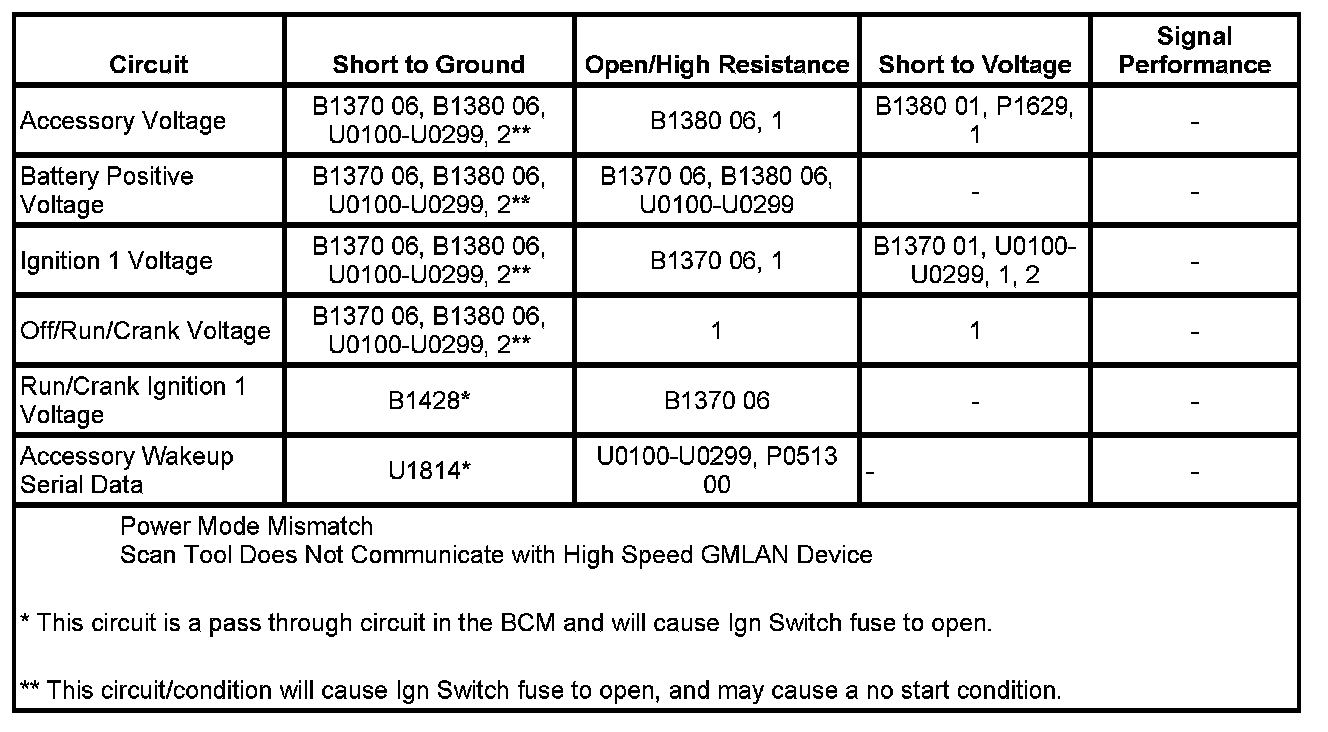 * Ignition 1 voltage, accessory voltage, or off/run/crank voltage circuit shorted to ground.