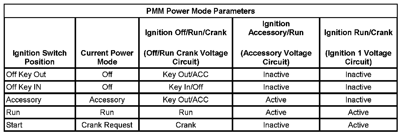 * The power modes and controls are determined using BCM logic. Comparing the Body Control Module Power Mode data display parameters listed in Circuit/System Verification will determine if there is a power mode fault.