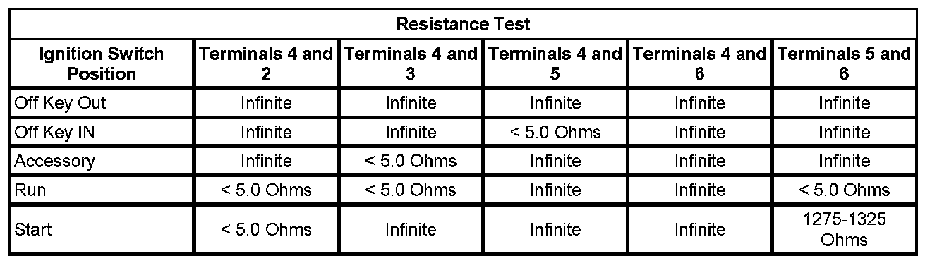2. Using the Resistance Test table below, check the resistance between the terminals of the ignition switch listed in each switch position.