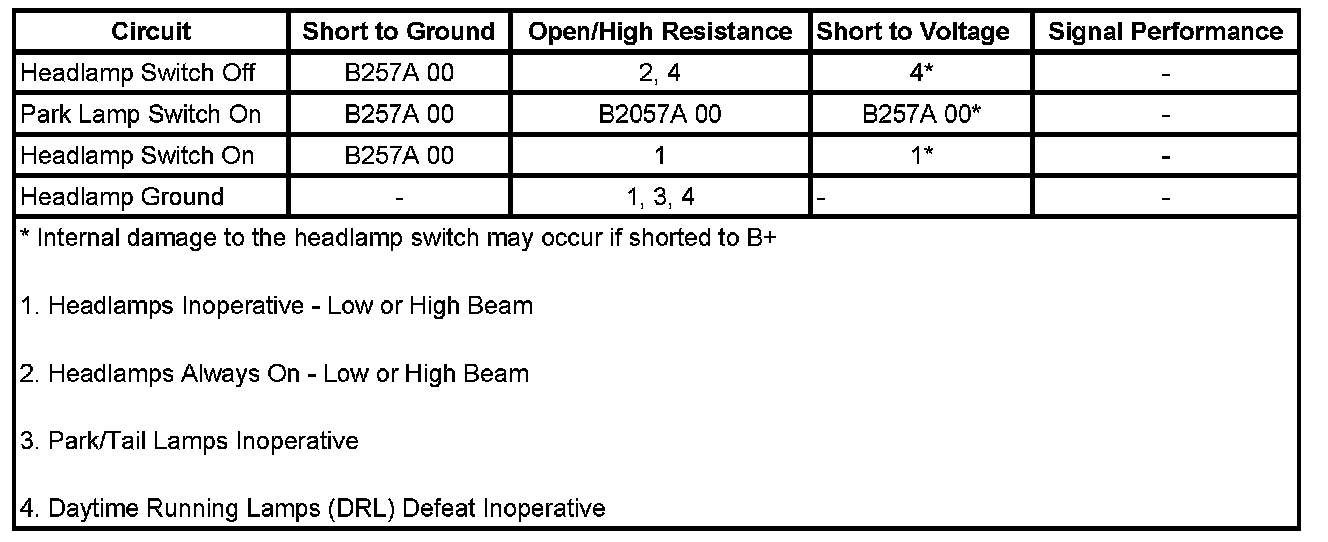 The BCM receives a mismatch signal between the headlamps OFF signal circuit, the headlamp switch headlamps ON signal circuit and the park lamps ON signal circuit.