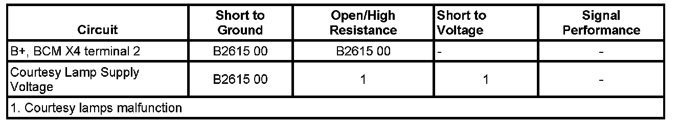 The BCM detects a short to ground on the courtesy lamp PCB relay control circuit.
