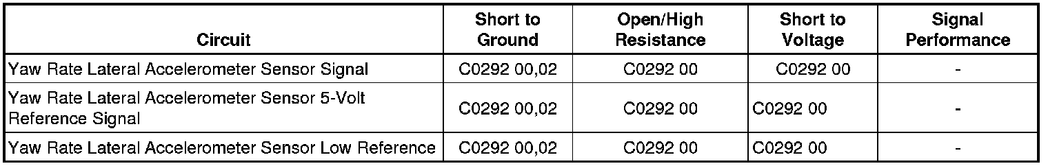 • If all circuits test normal, replace the yaw rate sensor and lateral accelerometer sensor, and perform the yaw rate reference table resetting in the EBCM.