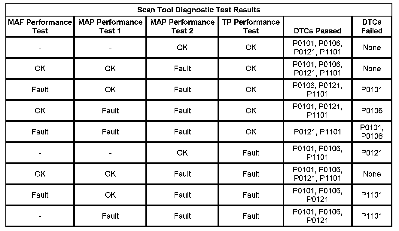 The estimates of MAF and MAP obtained from this system of models and calculations are then compared to the actual measured values from the MAF, MAP, and the TP sensors and to each other to determine the appropriate DTC to fail. The following table illustrates the possible failure combinations and the resulting DTC or DTCs.