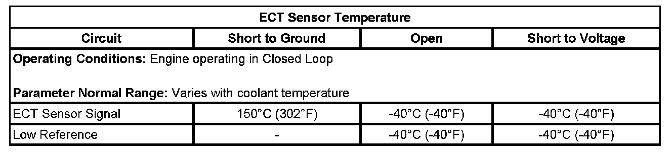 The ECM detects that the ECT is less than -39°C (-38°F) for more than 5 seconds.