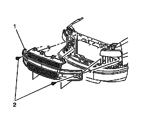 2. Remove the bolts (2) that retain the radiator grille (1) to the radiator support.