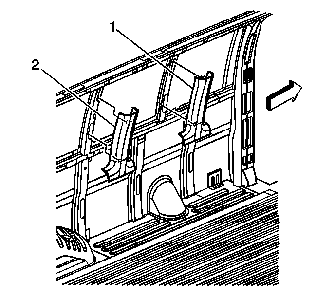 2. Pull out on the center pillar garnish (1,2) molding to disengage the clips.
