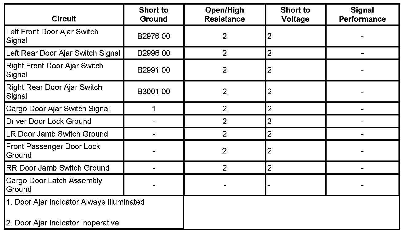 The body control module (BCM) monitors each door ajar circuit to indicate the status of the door. When the respective door is opened, the door ajar signal circuit is switched to ground by the door lock ajar indicator switch, the BCM detects the drop in voltage in the circuit and then communicates this status to the instrument panel cluster (IPC) via a serial data message. The IPC, upon receipt of this serial data message, will illuminate the appropriate ajar message in the driver information center (DIC) and when the transaxle is shifted out of PARK, the DIC will also send a serial data message to the radio to activate the door ajar audible warning.