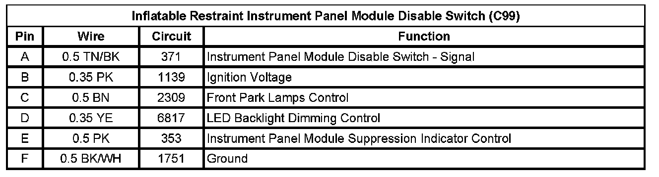 Inflatable Restraint Instrument Panel Module Disable Switch (C99)