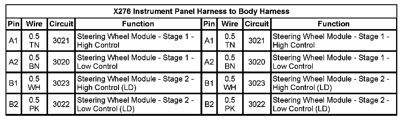 X278 Instrument Panel Harness To Body Harness Pin A1 To B2: