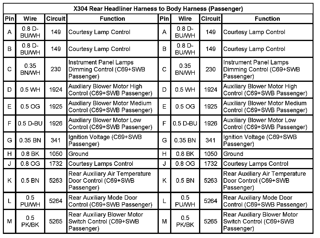 X304 Rear Headliner Harness To Body Harness (Passenger) Pin A To M: