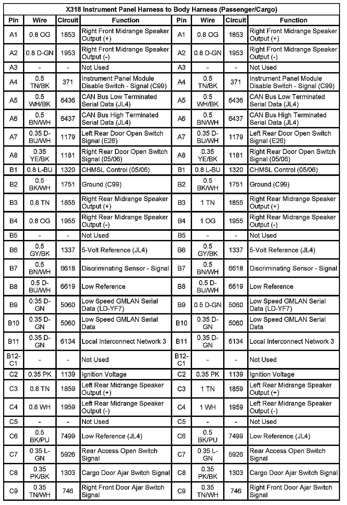 Inline Harness Connector End ViewsX318 Instrument Panel Harness to Body Harness (Passenger/Cargo)X318 Instrument Panel Harness To Body Harness (Passenger/Cargo)(Pin A1 To C9):