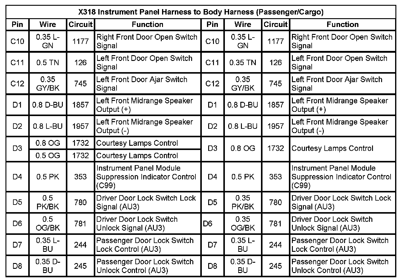 X318 Instrument Panel Harness To Body Harness (Passenger/Cargo)(Pin C10 To D8):