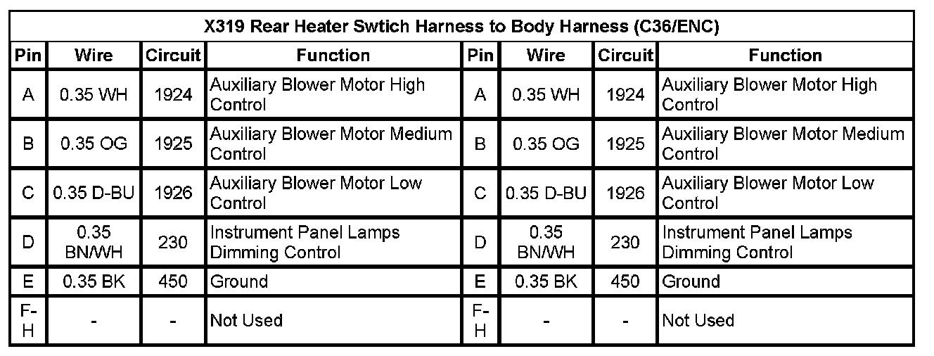 X319 Rear Heater Switch Harness To Body Harness (C36/ENC) Pin A To H: