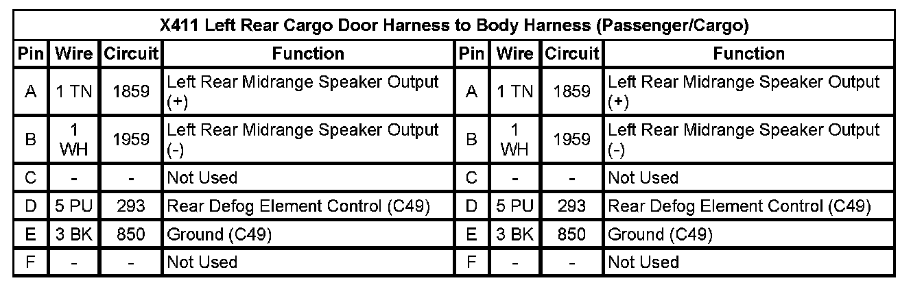 X411 Left Rear Cargo Door Harness To Body Harness (Passenger/Cargo) Pin A To F: