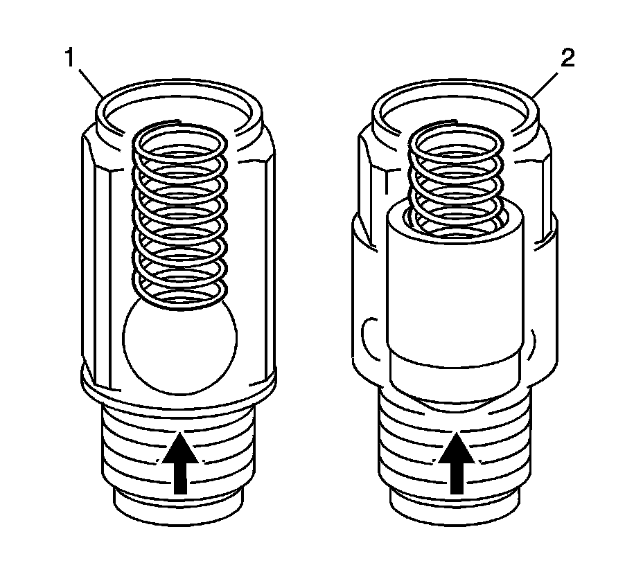 Important: First design valves (1) can be identified by a ball and spring design, an external hex the entire length of the valve body, and a captured washer. Second design valves (2) can be identified by a shorter external hex on the valve body, a valve and spring design, and no washer.