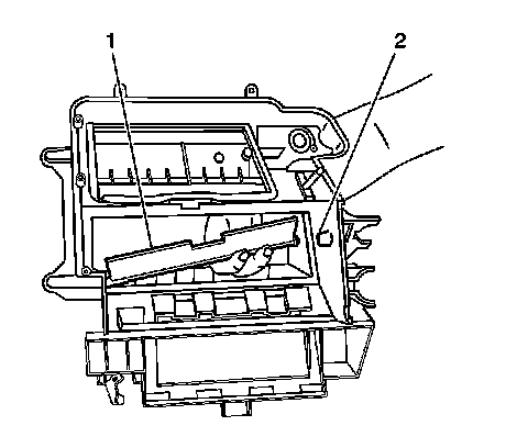 7. Remove the lower mode door (1) from the inner heater case (2).