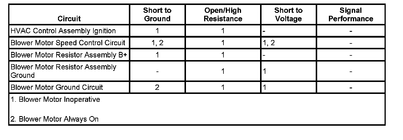 The HVAC control assembly applies voltage to the blower motor control circuit that corresponds to the selected blower speed. The resistors and the blower motor are in a series circuit. The following list represents the number of resistors in series with the blower motor per particular speed request:
