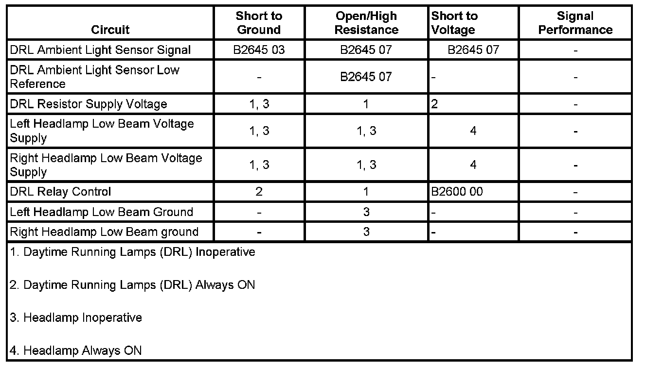 • If the test lamp is always OFF, test the supply voltage circuit between the DRL 1 fuse and the DRL 2 fuse for a short to ground or an open/high resistance. If the circuit tests normal, replace the underhood fuse block.