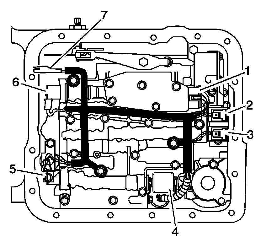 17. Snap the wiring harness in place on the valve body bolts. Ensure the harness loom tab is located under the TFP switch.