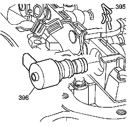 16. Install the torque converter clutch pulse width modulation (TCC PWM) solenoid valve (396) and the solenoid retainer (395).