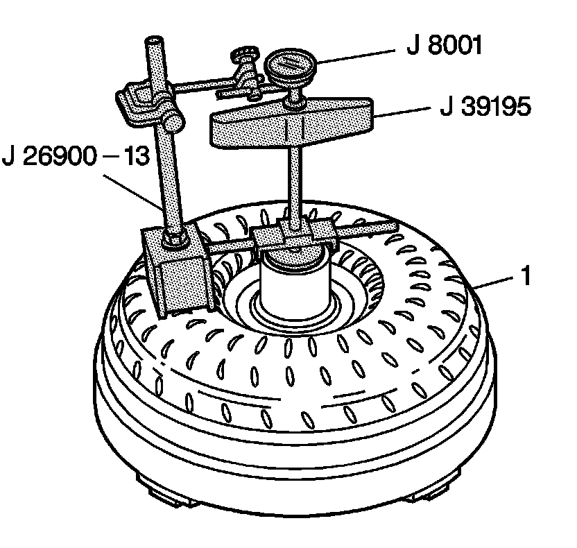 1. Place the J 39195 base into the torque converter assembly (1). The J 39195 will bottom itself on the face of the stator.