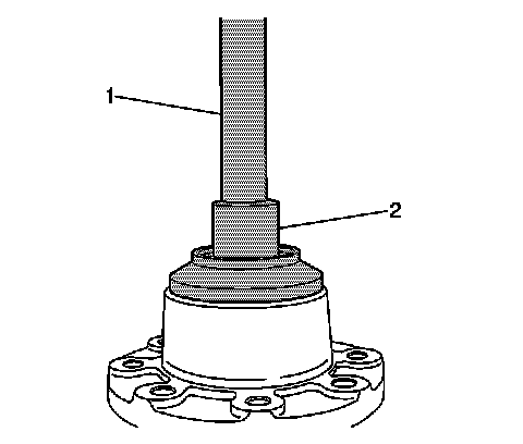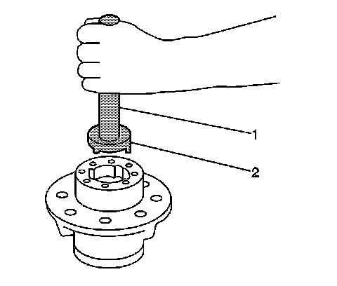 6. Turn the wheel hub over and seat the outer bearing assembly against the retaining ring using the J 24426 (2) and the J 8092 (1).