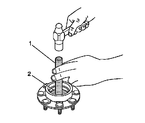 4. Drive the outer bearing cup into the wheel hub using the J 44419 (2) and the J 8092 (1).