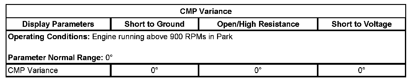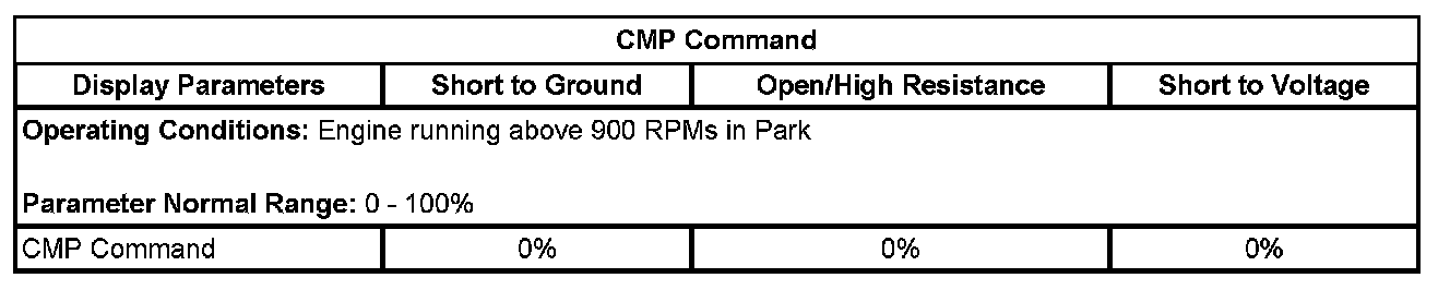 The ECM detects that the state of the high side driver and the state of the CMP solenoid control circuit does not match. The ECM will detect an open, high resistance, short to ground, or a short to voltage on the CMP solenoid control circuit, or an open on the low reference circuit, if the condition is present for more than 6 seconds.