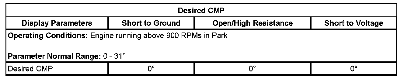 5. Command the CMP actuator from zero to 25 degrees. Verify the scan tool CMP actuator ckt short to volts test status parameter is OK.