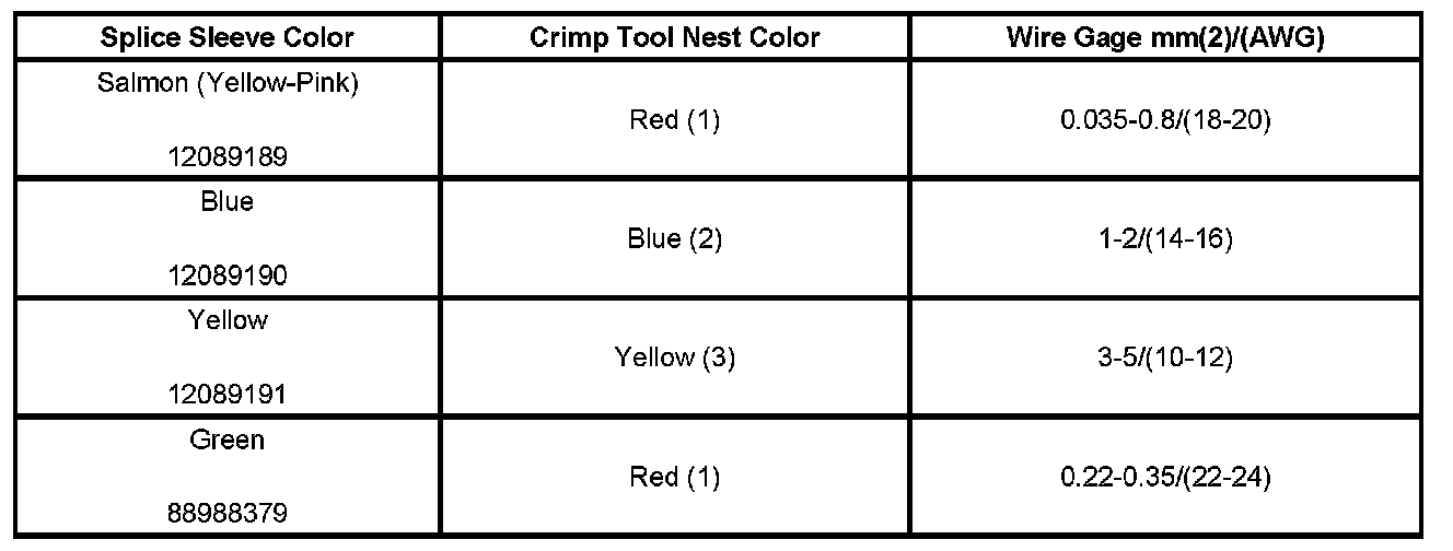 6. Select the proper DuraSeal splice sleeve according to the wire size. Refer to the above table at the beginning of the repair procedure for the color coding of the DuraSeal splice sleeves and the crimp tool nests.