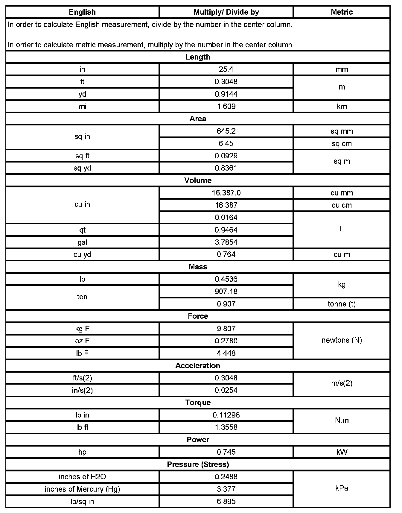 US English/Metric Conversion
