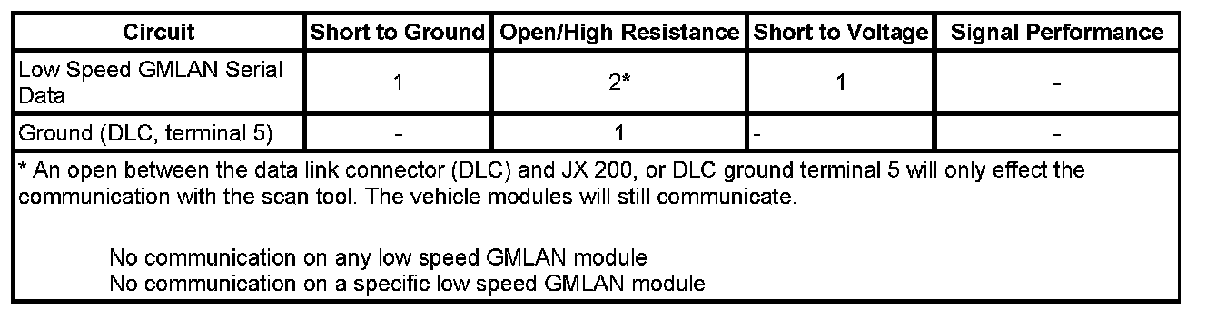* This test is used for a total low speed GMLAN communication failure. If only 1 module is not communicating and sets no DTC, ensure that the vehicle is equipped with the module, then use DTC U0100-U0299 for diagnostics.