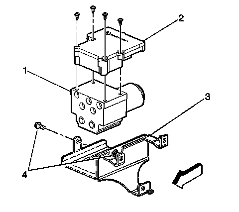 5. Remove the mounting screws that fasten the EBCM (2) to the brake pressure modulator valve (BPMV) (1).