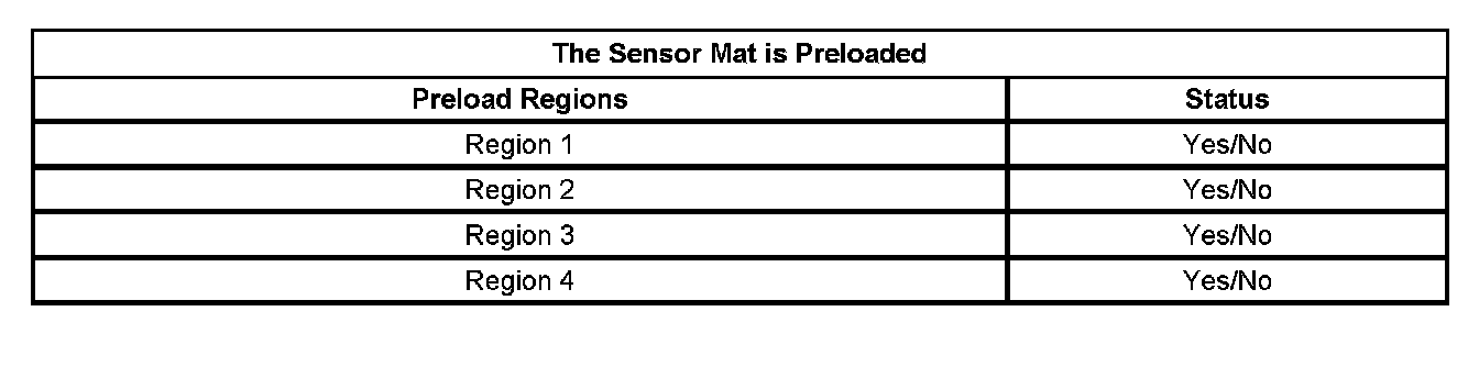 The PPS will fail the preload test when a region has detected a preload/pressure on it. If a preload test fails, the scan tool will display a chart as illustrated below. A Yes status indicates which region(s) have a preload condition. Refer to the chart below and the above illustration to identify the failed region.