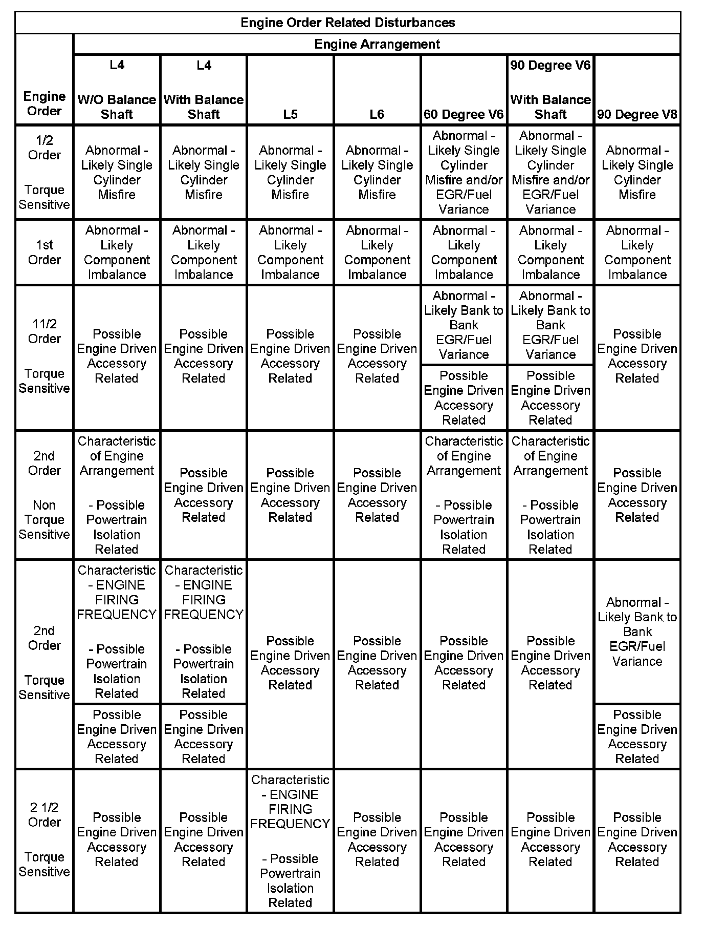 3. If the dominant frequency in Hz, recorded during duplication of the disturbance and the engine firing frequency in Hz, just calculated ARE related, then an engine FIRING FREQUENCY related disturbance is present. Engine firing frequency disturbances are usually related to improper isolation of a component. Refer to the Engine Order Related Disturbances table.